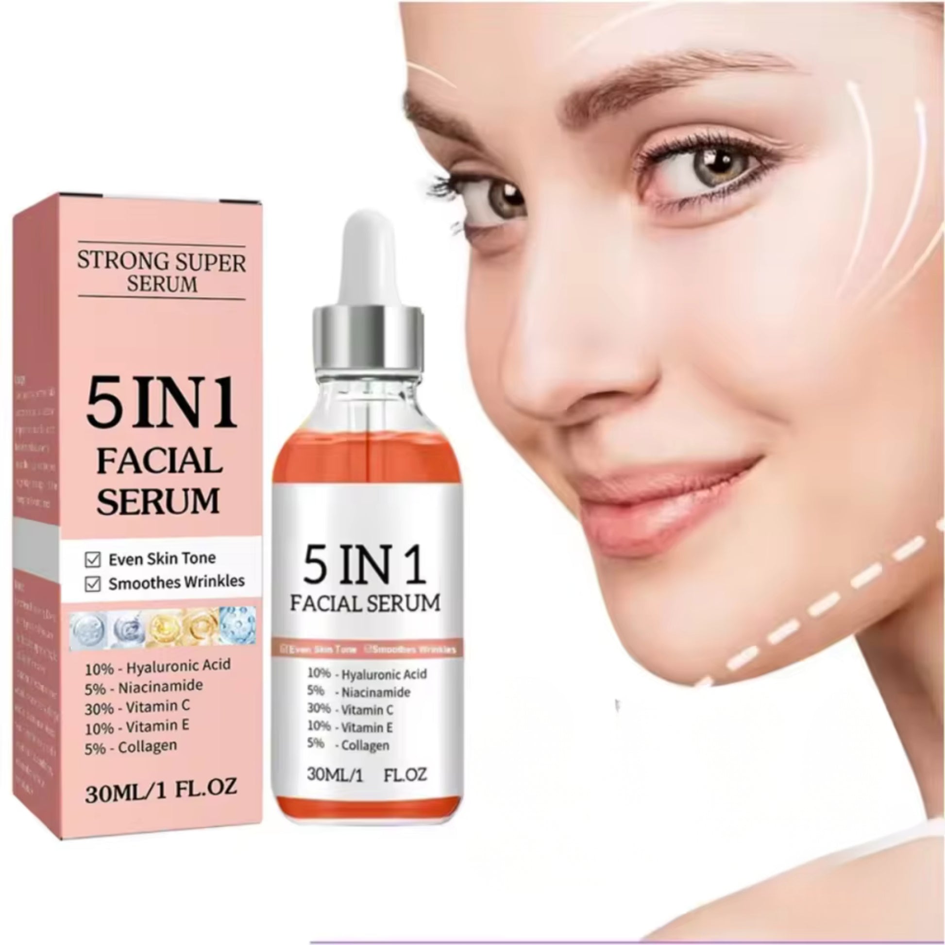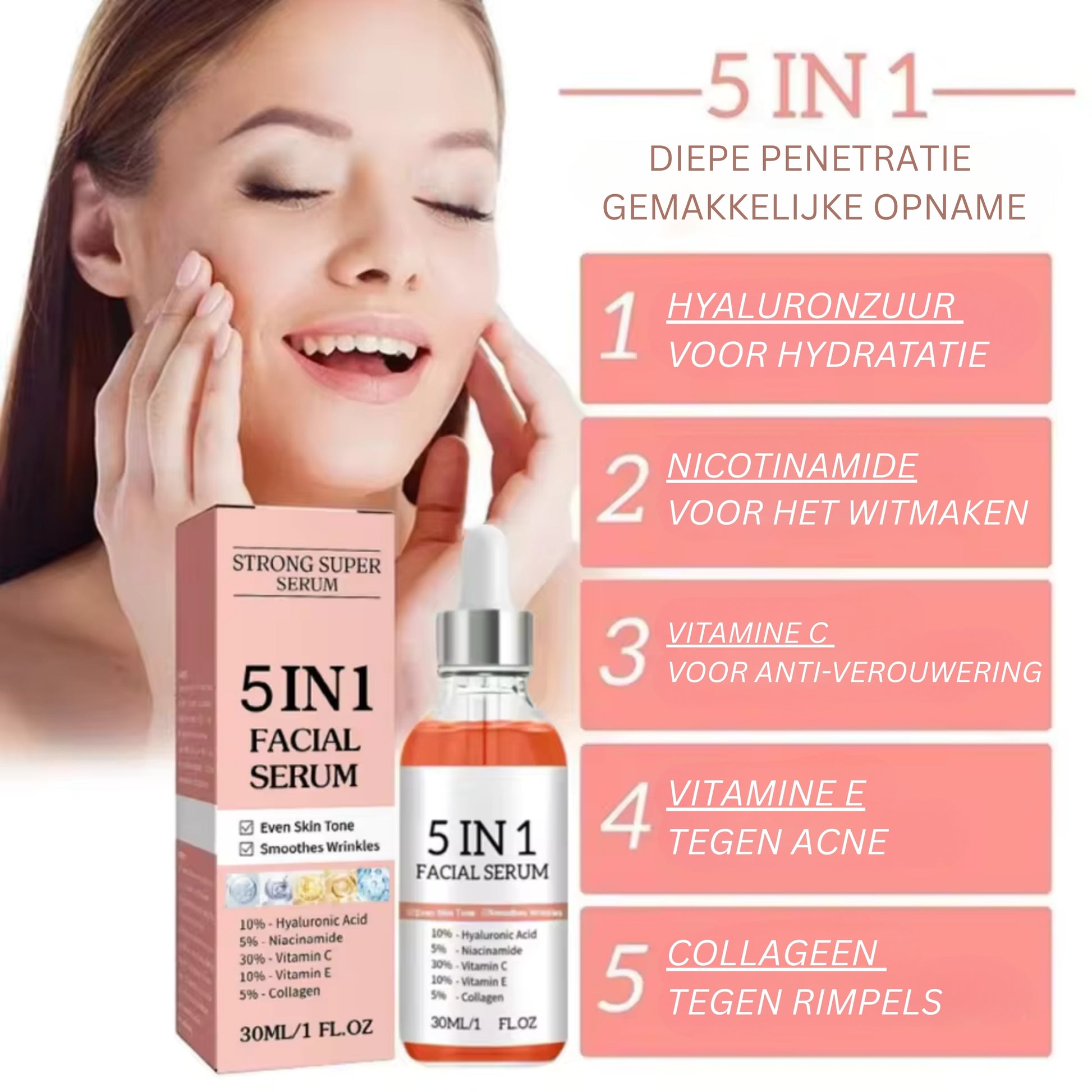 Veel vrouwen hebben last van een doffe huid, fijne lijntjes of vergrote poriën. Dat kan je onzeker maken en je huid vermoeid laten lijken. Met dit 5-in-1 gezichtserum geef je je huid de verzorging die ze verdient.